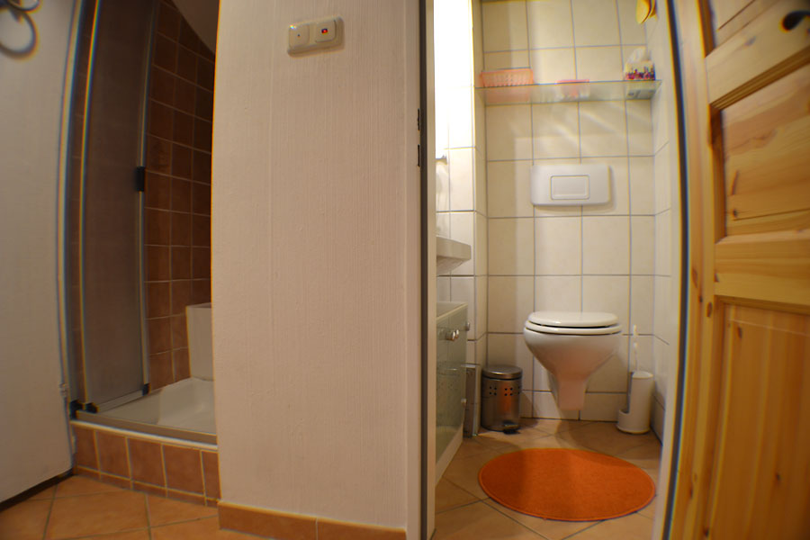 Die Duschkabine und das WC mit Waschbecken sind getrennt. Das Bad verfügt über einen Haarfön.